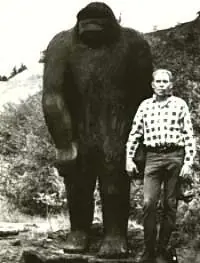 El buscador de piesgrandes René Dahinden, de pie junto a la estatua realizada por Jim McClain en Willow Creek, California. La figura, modelada según las descripciones de los piesgrandes vistos en la zona, tiene 2'40 m de altura, 1'04 m de anchura en los hombros y pies de 46 por 25 cm.