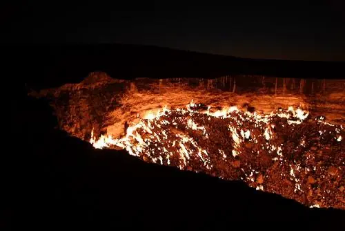El Pozo de Darvaza o cráter de Darvaza: también conocido como la puerta del infierno, es una antigua prospección de gas ubicada en el gran desierto de Karakum cerca de la pequeña aldea de Darvaza, en Turkmenistán. El desierto, que ocupa el 70% del país o 350.000 km², es muy rico en petróleo y gas natural. En los años 50, cuando el país aún formaba parte de la Unión Soviética, el gobierno quiso aprovechar dichos recursos realizando un pozo de unos 60 metros de diámetro por 20 de profundidad. En la actualidad, el cráter está vallado para evitar accidentes puesto que es uno de los principales lugares turísticos del desierto de Karakum.