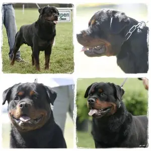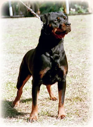 El Rottweiler descendiente como otros molosoides del Mastín del Tibet (foto) es una de las razas más antiguas. Su origen se remonta al imperio romano ,en ése entonces se usaba como perro de protección y conducción de ganado. Estos perros fueron migrando más allá de las regiones alpinas. En ese trayecto, éstos ejemplares se cruzaron con perros nativos germanos. A partir de entonces, la tarea principal del Rottweiler fue la de cuidar y conducir ganado mayor y defender a su amo y sus posesiones, en antiguas ilustraciones se puede ver como se le representa con una saca de monedas atada a su cuello. Su nombre: " perro de carnicero de Rottweil" lo obtuvo por la antigua ciudad imperial de Rottweil. Los carniceros lo criaban sólo de acuerdo a su rendimiento y utilidad. Fue así como, al paso del tiempo, se formó una raza de protección y conducción inmejorable, a la que también se le encontró utilidad como perro de tracción. Cuando a principios el siglo XX se buscaron razas caninas para el servicio policial, se demostró rápidamente que éste perro era perfectamente apto para las tareas de este servicio. Es por eso que en 1910 se le nombró oficialmente como perro policía. La crianza del Rottweiler origina una raza fuerte, muy vigorosa, de color negro, con marcas café-rojizas bien delimitadas, que a pesar de su apariencia totalmente enérgica, no deja de ser noble, siendo muy apropiado como perro de compañia, protección y trabajo.