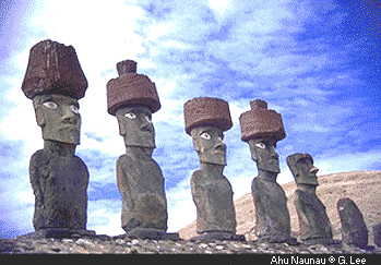 Algunas que estuvieron montadas sobre plataformas funerarias son bustos enormes, sin piernas y a veces alcanzan los 10 metros de altura y 7,6 metros de diámetro y pesan 20 toneladas, tienen un cilindro, un rojo copete de 1,8 x 2,4 m y se supone que estos "sombreros" fueron extraídos del cráter del volcán Rano Roi.