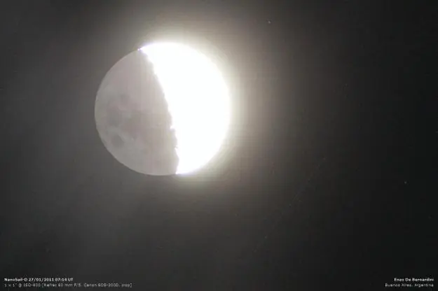 Una conjunción de la Luna y la NanoSail–D sobre Buenos Aires, Argentina, fotografiada por Enzo De Bernardini, el 27 de enero. En esta ocasión, la vela no era visible a simple vista. De Bernardini empleó un telescopio refractor de 3 pulgadas para capturar el haz de magnitud 7.