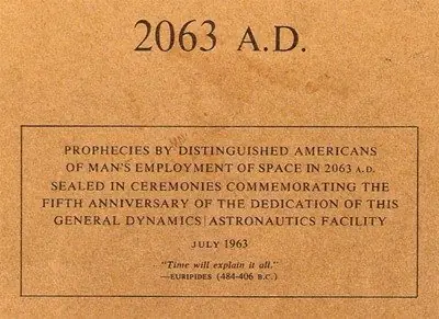 En Julio de 1963, en las instalaciones de General Dynamic en California se guardó una cápsula del tiempo destinada a ser abierta 100 años más tarde en el año 2063. El libro contiene predicciones de los científicos, de los políticos, de los astronautas y de los comandantes militares sobre el estado de la exploración de espacio en el año 2063. Se cree que solamente 200 copias fueron impresas. Desafortunadamente en el finales de los 90 el edificio fue demolido y la cápsula del tiempo fue destruida. Algunas copias restantes del libro de 2063 A.D. sobrevivierony podían afortunadamente ser reproducidos. Así, el libro afirma que para el año 2063 la fusión nuclear será el medio de propulsión estándar en las naves espaciales, los vuelos tripulados habrán llegado ya hasta Saturno y que la Luna y Marte estarán colonizados, con una población de unos 100.000 habitantes en el caso de la Luna y unos 10.000 en el caso de Marte. Otra afirmación que se hace es que no existirá una "agencia espacial mundial"; los avances en sistemas de propulsión abaratarán los costes de los vuelos espaciales, permitiendo que cada país desarrolle su propio programa espacial.