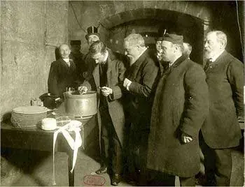 En la navidad de 1907, un grupo de hombres recolecto 24 discos de carbón cuidadosamente envueltos y depositados en dos contenedores de hierro y plomo. Cada uno fue sellado y tapiado en un cuarto con una nota que decía "éste mostrará a los hombres dentro de 100 años a partir de ahora en adelante sobre el estado de nuestras máquinas que hablan y las voces de los cantantes principales de nuestras épocas". En 1912 dos urnas más fueron agregadas al archivo, además un gramófono operado manualmente y las instrucciones de cómo utilizarlo. En 1989, durante la instalación del aire acondicionado fue descubierto que el archivo había estado quebrado una de las urnas de 1912 estaba vacía y el gramófono faltaba. El resto del archivo fue transferido inmediatamente a la biblioteca nacional de Francia en París. A fines de 2007 el archivo fue abierto. Aparte de esos desaparecidos, los discos eran inutilizables.