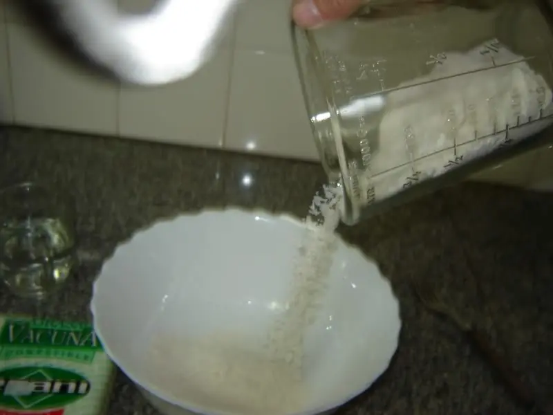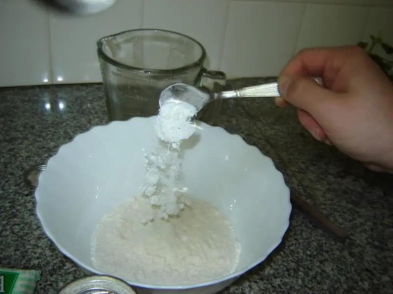 La harina, si es harina leudante, obviar el polvo de hornear, porque ya lo trae mezclado.