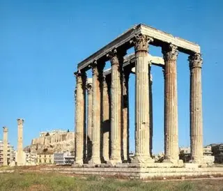 construido en el siglos V en Delfos, combina veinte columnas doricas exteriores con diez columnas corintias interiores.