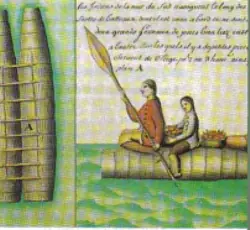Ancestros de las piraguas actuales, las balsas de junco de doble casco debieron transportar a los primeros habitantes de la Polinesia. Acuarela del siglo XVIII. (Servicio histórico de la Marina, Vincennes. Francia)