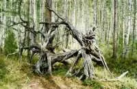 dijo:Restos de árboles hechos añicos en Tunguska a consecuencia de la onda de choque producida por la explosión en la atmósfera terrestre de un pequeño cuerpo de menos de 100 metros de diámetro en junio de 1908.