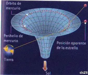 La teoría de la relatividad general postula que la presencia de un cuerpo de gran masa deforma el espacio que lo rodea. Este hecho explica el comportamiento anómalo, de acuerdo con la Teoría de Kepler y de Newton, del movimiento del planeta mercurio durante el perihelio de su órbita. La discrepancia en el movimiento es de 43s de arco por centuria. El diagrama muestra cómo una superficie bidimensional "se deforma en una tercera dimensión" y hace que las líneas rectas se transformen en curvas.