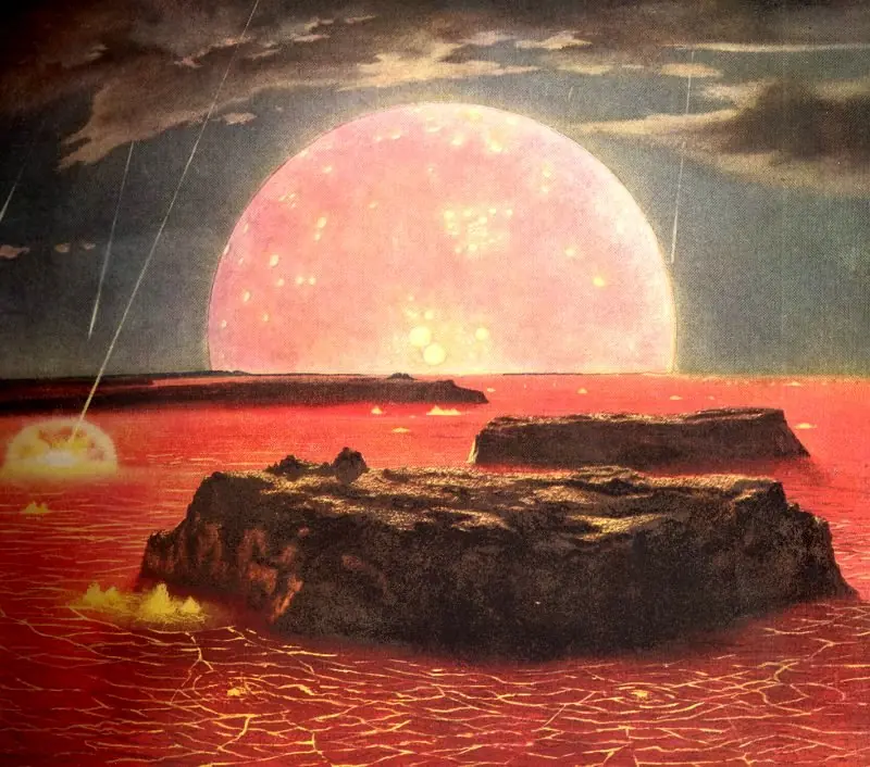 Pero los efectos que producen la libración también tienen otra consecuencia muy interesante, que mencionamos de pasada al hablar sobre el período hadeico de la historia de la Tierra (¿recuerdas aquél dibujo del “infierno” con una Luna enorme en el cielo, que reproducimos de nuevo más abajo?): la Luna está ahora mucho más lejos de la Tierra de lo que estaba antes, y se aleja de nosotros todo el tiempo.