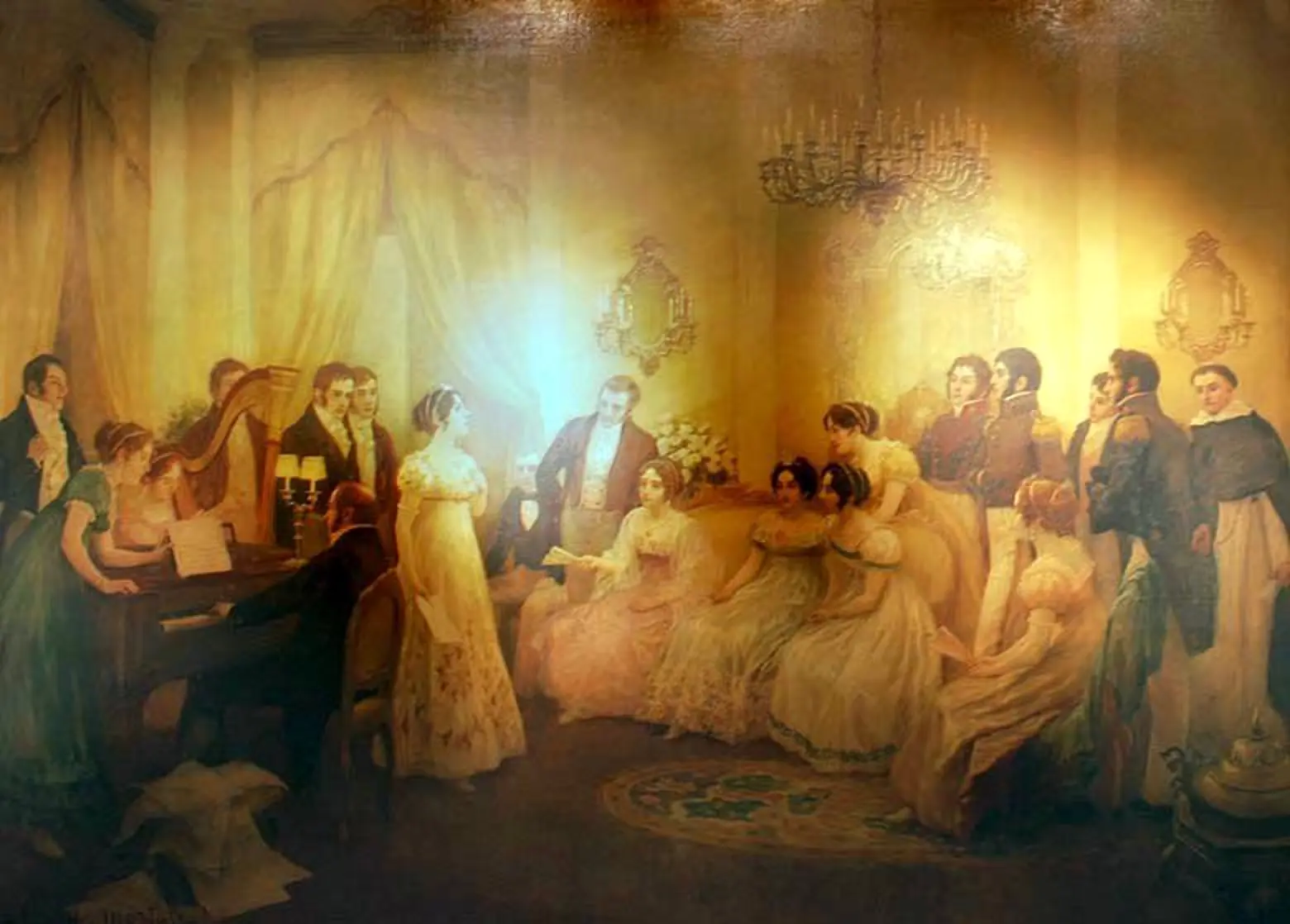 (esta imagen muestra la Primera ejecución del Himno Nacional, en la casa de María Sánchez Thompson)