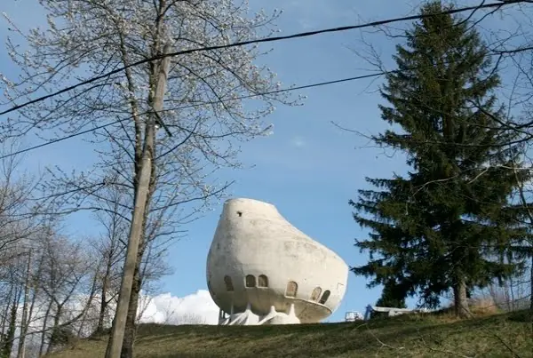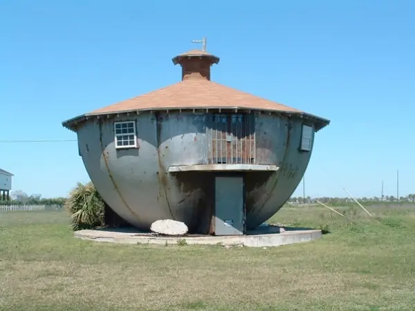 Se trata de un local de entretenimientos. Pero sus creadores aseguran que en realidad fue laboratorio construido en una remota isla del Triángulo de las Bermudas y que tras un experimento fallido estalló para caer de punta donde se encuentra.