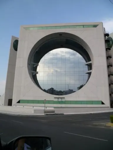 Una foto de uno de las construcciones más famosas de la Ciudad de Mexico, un edificio corporativo, bajo el nombre de Corporativo Calakmul, creado en 1994, alberga empresas como Pepsi Co., Phillips Morris, Ericsson, entre otras. Conocido como 'La Lavadora' por su peculiar forma pero que en realidad tiene un significado distinto según su creador Agustín Hernández (México, DF, 1928) que menciona: