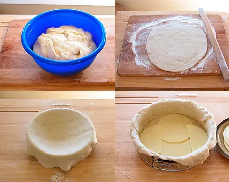 Una vez preparada la masa, dividir en dos círculos de tamaño diferente. El más grande debe servirnos para llenar el fondo y los lados de un molde redondo desmontable. Engrasamos ligeramente el molde. Colocamos el primer círculo de masa en el molde y comenzamos a rellenar.