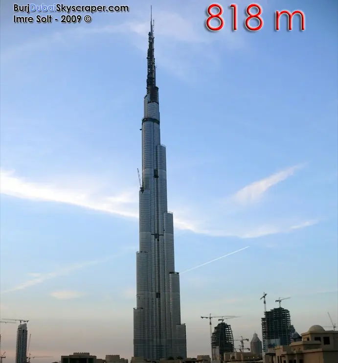 La altura de este edificio el mucho mas alta que la de cualquier otra.Un ejemplo es el Tapei 101 el segundo edifico mas alto del mundo que mide 508m, de diferencia con el Burj dubai son de 310m una altura muy considerable.No solamente es el rascacielos mas alto sino que la estructura sin cable mas alta del mundo superando a la ex-estructura mas alta La Torre CN 553M