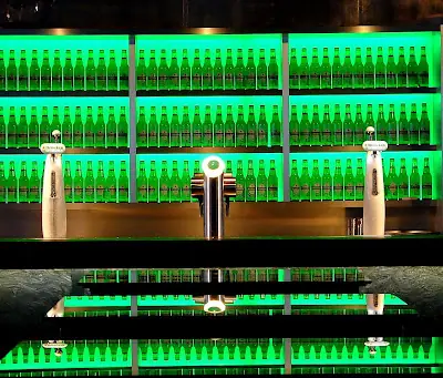 La sala de acogida del museo está decorada con paredes formadas por unos ladrillos muy especiales: botellas verdes de Heineken. Esta idea forma parte de un viejo proyecto arquitectónico de 1960, 'The World Bottle', pensado para construir pequeñas casas que nunca llegó a realizar-se. Un toque de diseño vanguardista que deja paso inmediatamente a una fiel recreación del ambiente del Amsterdam de mediados del XIX que vivió el fundador de la Compañía, Gerard Adriann Heineken.
