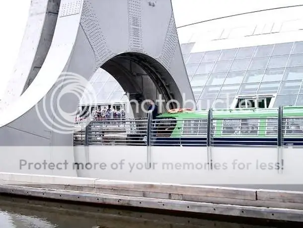 Esta maravillosa obra de ingeniería se llama Rueda Falkirk. Este es el único carrusel acuático de transporte en el mundo. En este punto los dos canales difieren 24 metros, algo así como el alto de un edificio de ocho pisos, de modo que un sistema de esclusas normales no sería factible en un tramo corto.