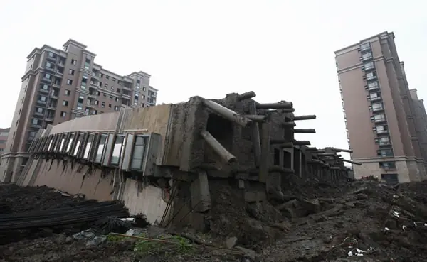 El edificio se derrumbó por la base durante la madrugada , hacia las 5:30 hora local (9:30 horas GMT del sábado), lo que provocó que la construcción cayera hacia un lado y, sin llegar a desmoronarse, quedara casi intacta, apoyada en una fachada como un árbol caído y mostrando los cimientos. Solo una persona murió. Esto sucedió en Shangai, China.