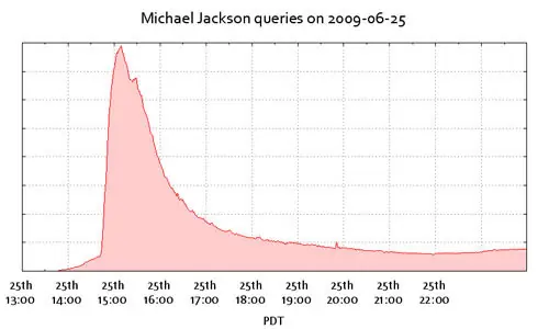 El volúmenes en las búsquedas relacionadas al Rey del Pop comenzó a incrementar a las 16:00 horas, se catapultó a las 17:00 y comenzó a estabilizarse alrededor de las 22:00, según informa el blog.