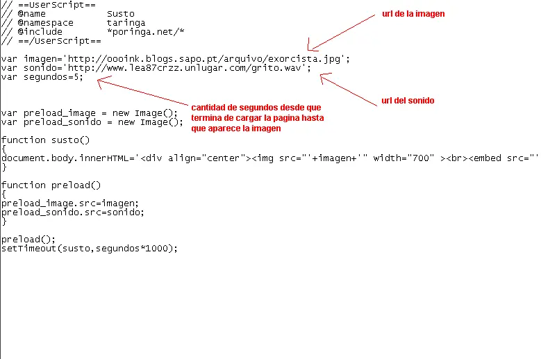 bueno, este script es una adaptacion del quemadisimo laberinto donde te aparecia la cara de la mina del exorcista. lo que hace es al abrir la pagina indicada, despues de un tiempo determinado, una imagen te ocupa la pagina entera y se reproduce un sonido