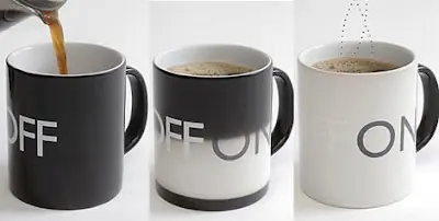Esta taza es una pasada: reacciona al calor y nos informa del estado del líquido que contiene. Si está caliente el estado normal cambia y nos muestra la palabra “ON” cambiando también el color. Si el contenido está frío o la taza está vacía muestra el mensaje “OFF“.
