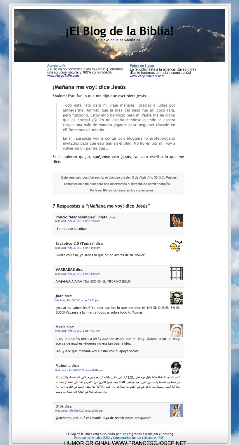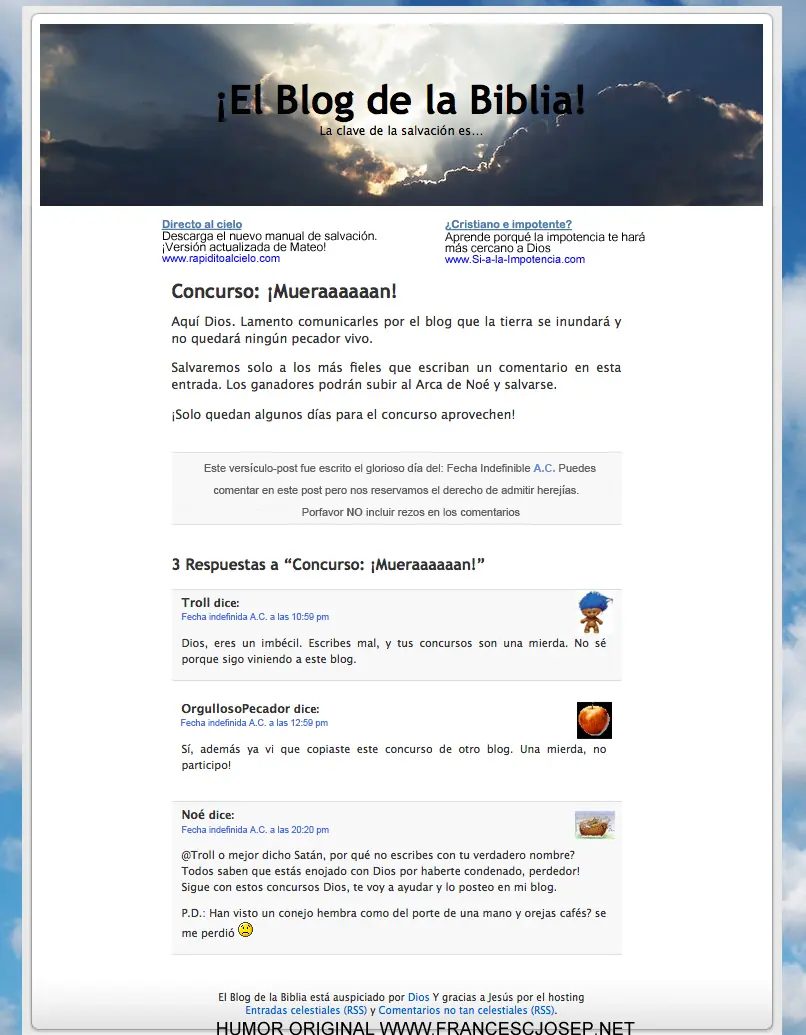 ¿Cómo se vería la biblia si fuese un blog? Esa es la idea de esta nueva pieza de humor. Déjenme decirles que aprendí mucho más de la Biblia haciendo esto que durante 14 años de religión en el colegio ¡Quizás ustedes también!