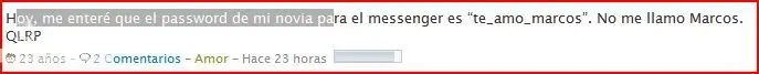 secretos, el mejor compilado de los que encontre en diversas paginas fuentes: http://www.elsecreto.com.ar http://www.tusecreto.com.ar/ http://www.confiesalo.com http://quelorepario.com