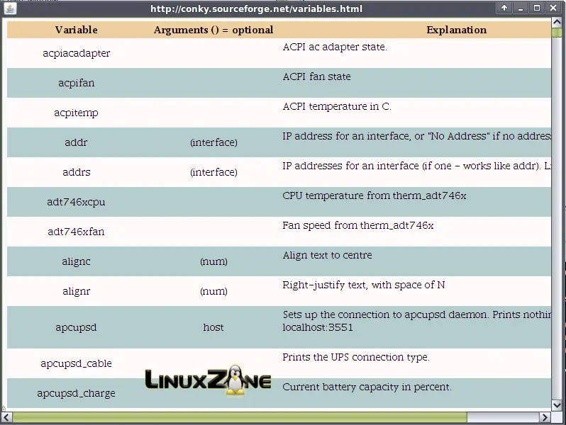Además de la facilidad de acceso rápido a las opciones que nos permite conkygui, presionando la tecla F1, encontraremos una pequeña guía explicativa sobre cómo utilizar todas las variables de conky: