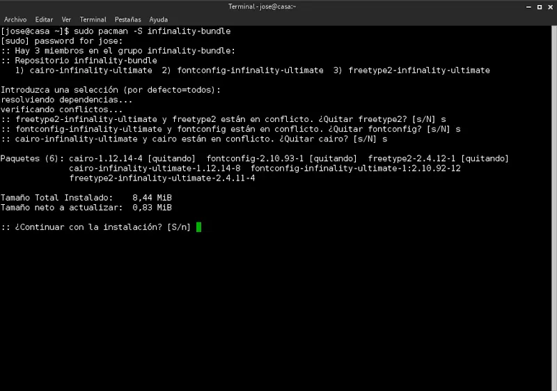 :: freetype2-infinality-ultimate y freetype2 están en conflicto. ¿Quitar freetype2? [s/N] s