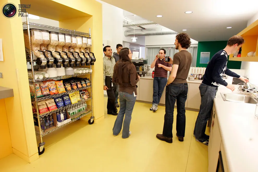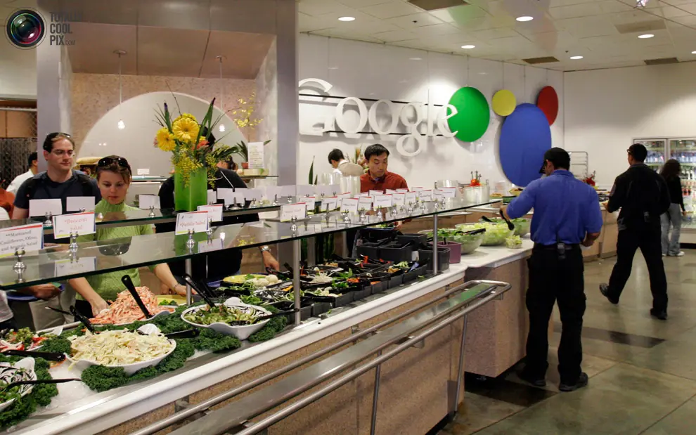Los empleados tienen su almuerzo libre y pueden elegir uno de los quince cafés diferentes que tienen en la cafetería.