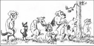 Llega un paisano al bar del pueblo y deja atada su perra a un árbol. Al instante una jauría de perros se arremolina a su alrededor tratando de conquistarla. En medio de un concierto de ladridos, gruñidos, mordiscos y aullidos, un policía entra al bar y pregunta por el dueño de la perra. El paisano, que estaba tomando un vaso grande de ginebra, levanta la mano y dice: "yo".