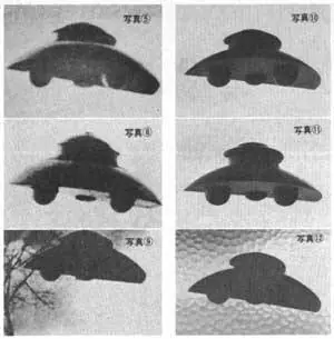 Esta es la última de una rápida serie de cuatro fotos tomadas a traves del telescopio por George Adamski el 5 de Marzo de 1951. En la primera foto solamente está visible un único platillo. En cada foto posterior, más platillos salen de la nave nodriza hasta los seis que se observan en ésta exposición.