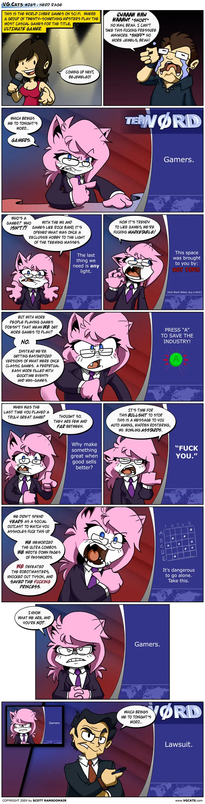 Este es el evento mundial de civer juegos por Scifi. Donde un grupo de veintialgo hipsters, juega los mas casuales juegos en competencia por el titulo del Ultimate Gamer. A continuacion Bejeweled. Noo de ningun modo hermano, waaa! no soporto la presion, no mas joyas. bua. Lo que nos lleva a la palabra de esta noche: Gamers. Quien es y quien no es un gamer? Con la llegada del wii y juegos como rock band, se ha abierto lo que antes era un reclusivo pasatiempo, a la luz y las masas aburridas. Lo ultimo que nesecitamos es luz. Ahora es una moda que te gusten los juegos de video, somos un simple mercado. Este espacio es traido a ustedes por Hot Topic, y shark robot, porfavor compren una camiseta. Pero con mas gente jugando juegos de video no significa que haya mas juegos para nosotros. NO, Solo tenemos copias bastardas de lo que fueran juegos clasicas, un continuo modo facil en cada juego que jugamos, llenos con mini juegos y eventos rapidos. Presiona A para salvar a la industria. Cuando fue la ultima vez que jugaste un juego realmente bueno? Piensalo, solo son algunos y salen con mucho tiempo entre si. Porque hacer algo grandioso, si de todos modos bueno se vende bien? Es tiempo para parar esta tonteria, este mensaje es para todos ustedes, automiras, entrenadores Madden y bolicheros bastardos de Wii. JODANSE. No gastamos años de aislamiento social, solo para mirar como un monton de pendejos joden todo. Nosotros memorisamos ultracombos. Nosotros escribimos paginas y paginas de passwords. Nosotros vencimos a los amos robots, noqueamos a Tyson y salvamos a la jodida princesa. Yo se lo que somos nosotros y se lo que no son ustedes. Gamers. Lo que nos lleva a la palabra de esta noche. Traje de abogado. (Este por un lado me dio risa, por otro lado me hizo sentir viejo y nostálgico y por un tercer lado me hizo decir demonios es cierto, ahora cualquier pajero de 13 años se siente el mejor jugador del mundo por asesinar a un noob en halo)