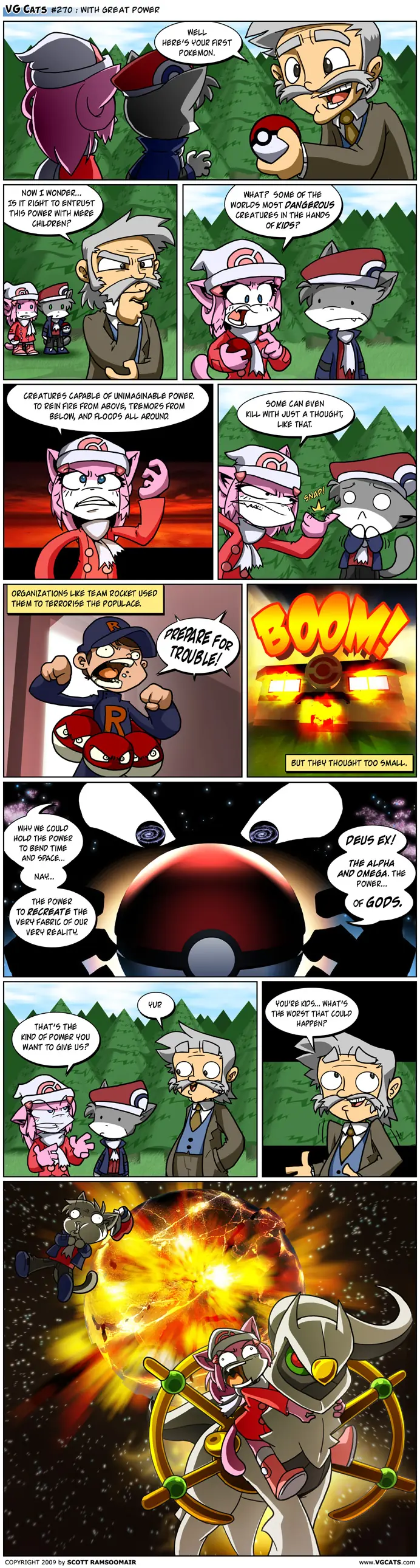 Bueno aqui tienen su primer pokemon. Ahora me pregunto si sera lo correcto confiarles este poder a unos simples niños. Que? algunas de las mas peligrosas creaturas del mundo en manos de niños? Creaturas capaces de lanzar fuego, de crear terremotos de la nada, de inundar continentes. Algunos simplemente pueden matarte con un pensamiento. Algunas organizaciones como el equipo rocket los usan para aterrorizar a la poblacion. PREPARENCE PARA LOS PROBLEMAS!! KABOOM!!! Pero ellos piensan en pequeño. Porque podrias obtener el poder de doblar el espacio y el tiempo... no de recrear la fabrica de nuestra realidad. El Deus EX, el alfa y el omega el poder de...dios. Es ese el poder que nos das? Si, son simples niños que es lo peor que podría pasar