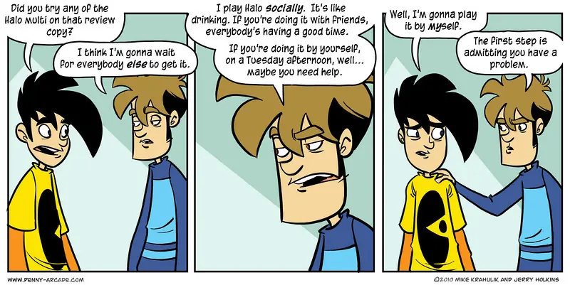 Has probado ya el nuevo modo multiplayer de Halo, el que viene con el previo del juego? No, yo juego Halo de modo social, es como beber. Si lo haces con tus amigos todos lo pasan bien y se divierten. Si lo haces solo, un martes por la tarde, bueno entonces quizas tengas un problema. Bueno, pero prefiero jugarlo solo. El primer paso es admitir que tienes un problema mi amigo.