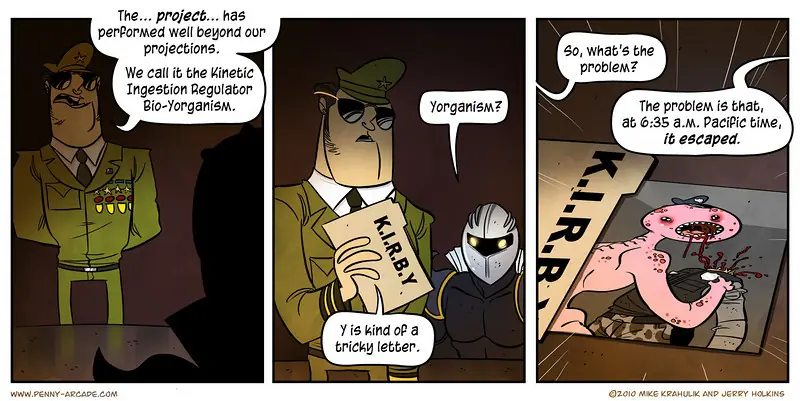 El proyecto fue más alla de nuestras proyecciones. Nombre Clave: Kinetico Ingestor Regulador Bio Yorganismo. ¿Yorganismo? Si es una palabra trucada. y? cual es el problema? el problema es que a las 635 hora del pacifico el escapo. (Explicacion del chiste para los despistados: las siglas forman el nombre Kirby y el Metacaballero interpreta lo que parece ser una version de Snake)
