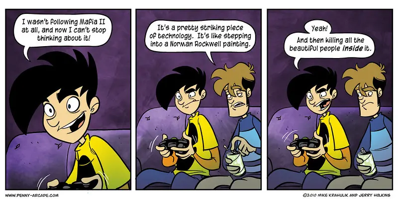 Yo ni siqiuera era fan de Mafia II y ahora no puedo dejar de jugar. Es una muy impactante pieza de tecnologia Es como entrar en una pintura de Norman Rockwell. Y matar a todas las personas bonitas que estan ahi dentro