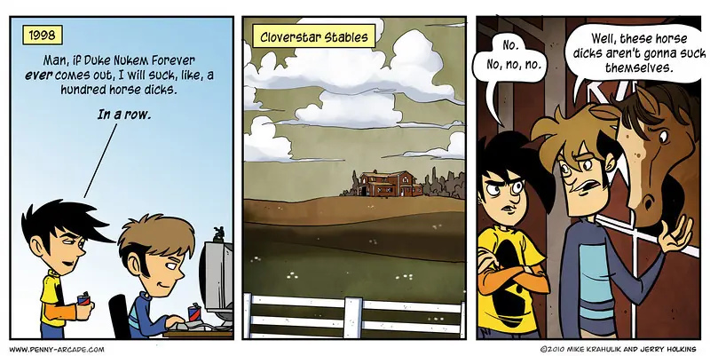1998: Amigo te juro que si algun dia llega a salir Duke Nukem Forever voy a chuparle el pene a un centenar de caballos. En una ronda. Establos Cloverstar 2010: No, no, no, no. Anda esos penes no se chuparan solos.