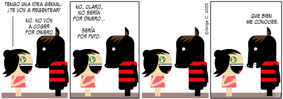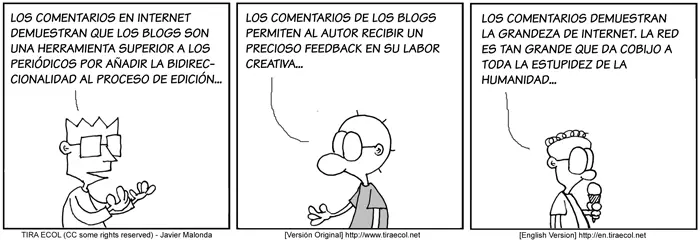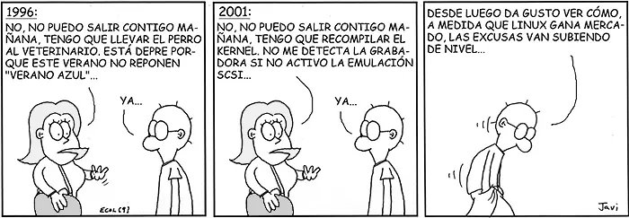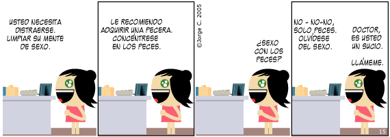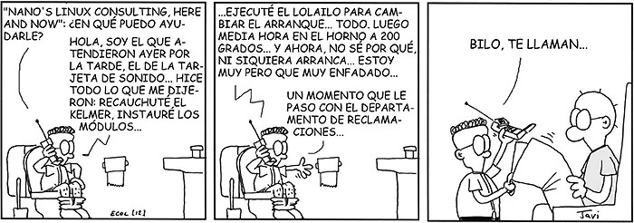 La siguiente tira es la Tira Ecol, (visitala en http://www.tiraecol.net/modules/comic/ ) En esta tira encontraremos chistes relacionados con dos de nuestras grandes pasiones, la informatica (atencion usuarios de Linux aqui se divertiran mucho) y el sexo (publico en general que se ria de los chistes picaros) En esta tira se nos narra la vida diaria de unos amigos, Nano (un sujeto de corta estatura y gran obseso sexual, que termina siendo todo un versado en linux) Bilo un informatico experto en linux y en informatica en general que es bastante torpe con las mujeres. Advertencia: Este humor es muy geek si no se rie, no es mi culpa: