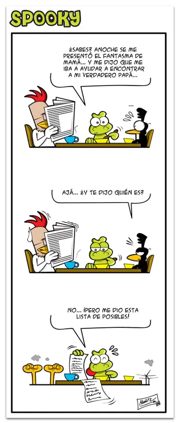 La cuarta tira que voy a recomendar es Spooky (visitala en http://www.alexmh.com/la-tira-de-spooky/) En esta tira se nos narran las aventuras (sexuales en su mayoria) de una lagartija? llamado Spooky que tiene una gran debilidad por las mujeres y las ovejas