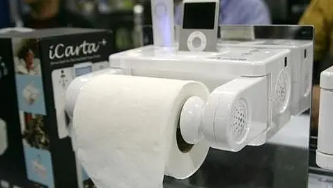 El más surrealista de todos. Este altavoz para dispositivos como el iPhone o el iPod incluye un soporte para colocar el rollo de papel higiénico en el cuarto de baño y hacer nuestras necesidades con música de fondo. Su nombre completo es “iCarta Toilet Roll Holder”.