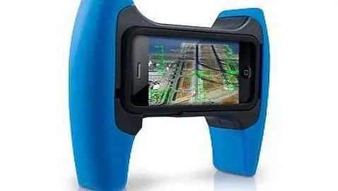 Esta especie de volante en realidad es un adaptador para jugar más cómodamente con el iPhone. Siempre y cuando estés sentado en el sofá de casa, o en algún lugar cómodo.