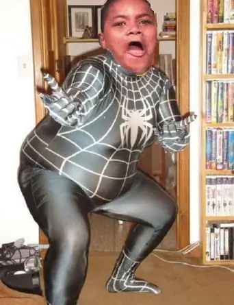 El Grone muy gordo con un traje de Spiderman.Olvidó ponerse la máscara.