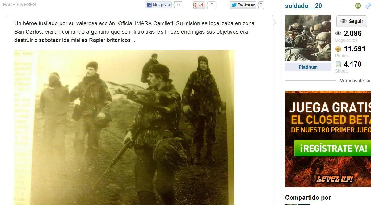 ''Un héroe fusilado por su valerosa acción, Oficial IMARA Camiletti Su misión se localizaba en zona San Carlos. era un comando argentino que se infiltro tras las lineas enemigas sus objetivos era destruir o sabotear los misiles Rapier britanicos .."