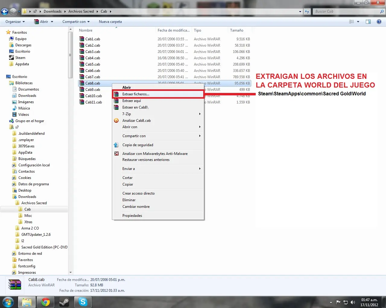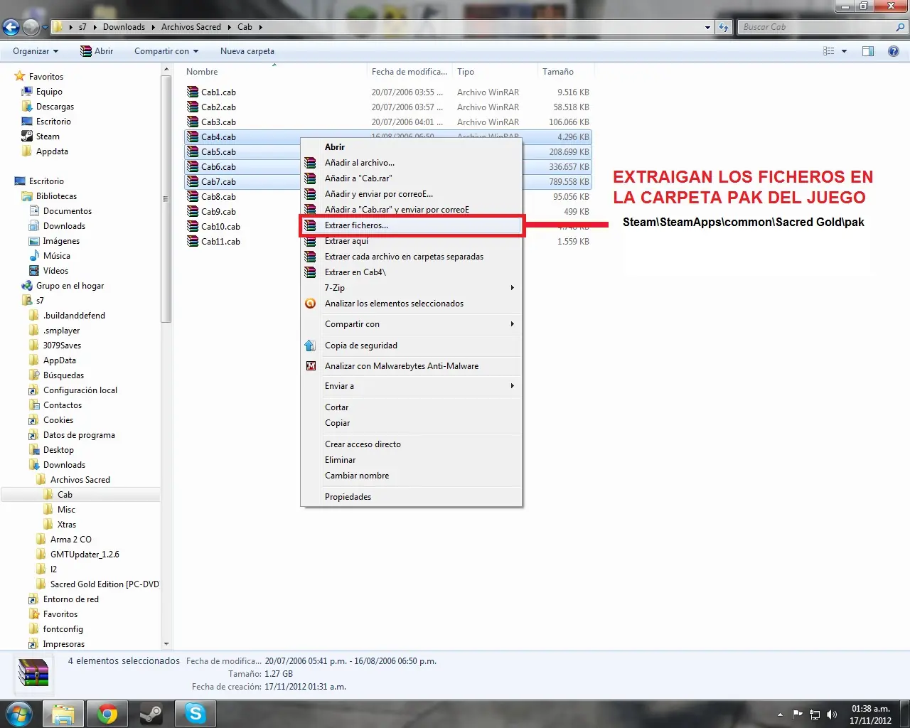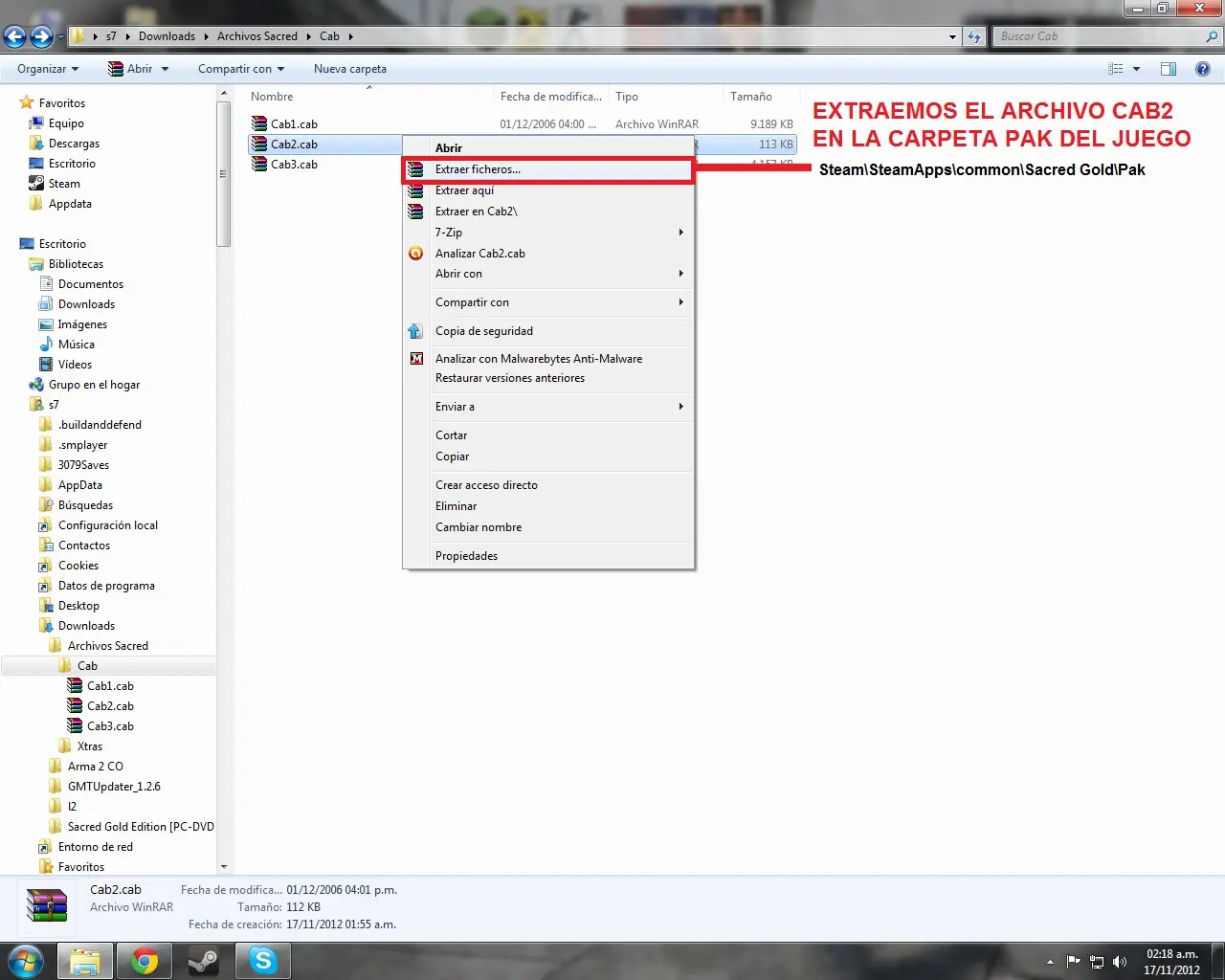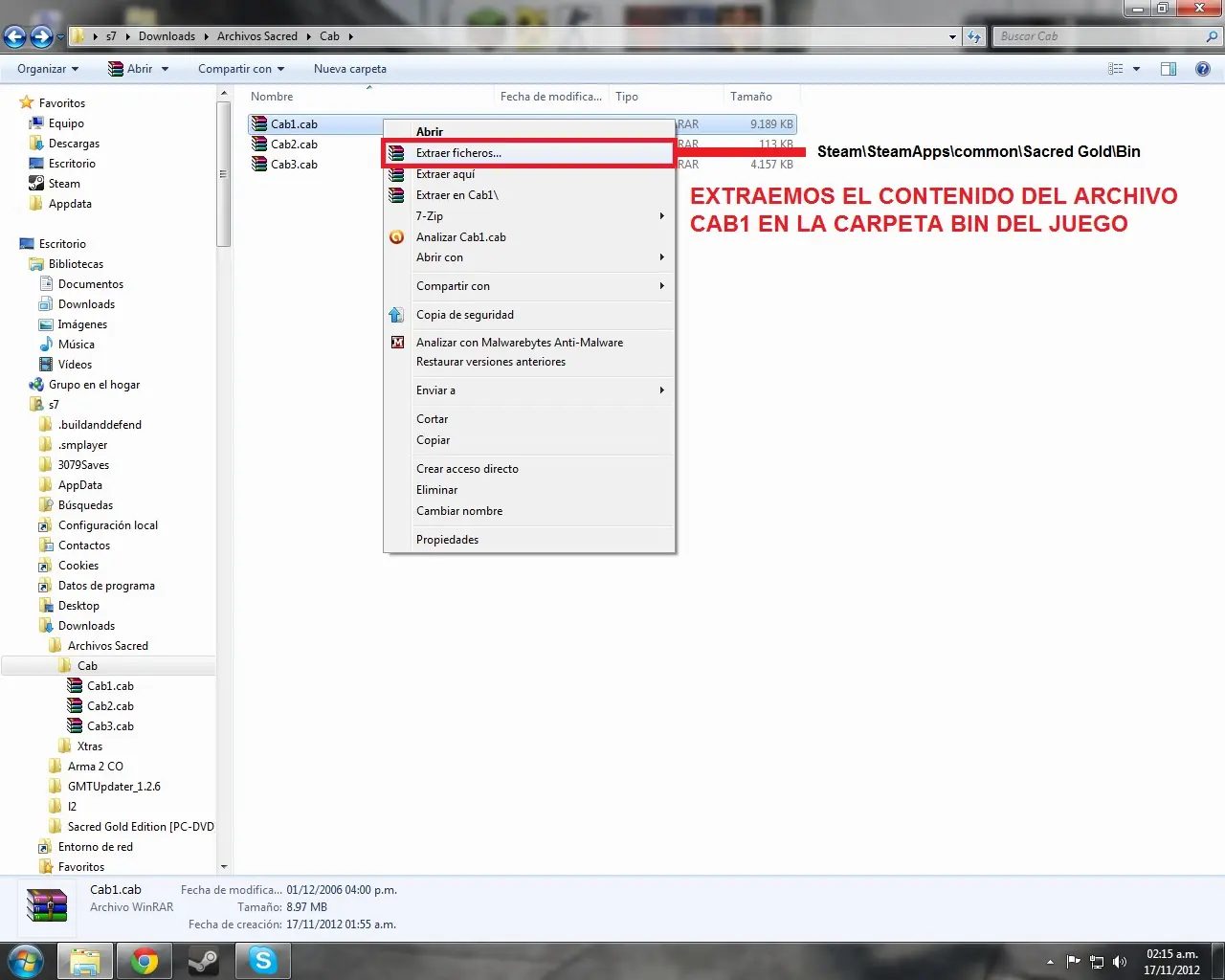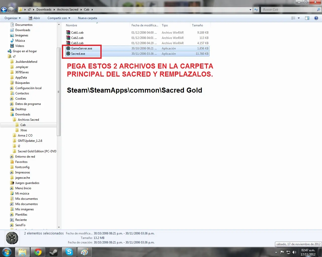 7) Y por ultimo los 2 archivos .exe del Cab3 (GameServer.exe y Sacred.exe) van a la carpeta principal del juego.