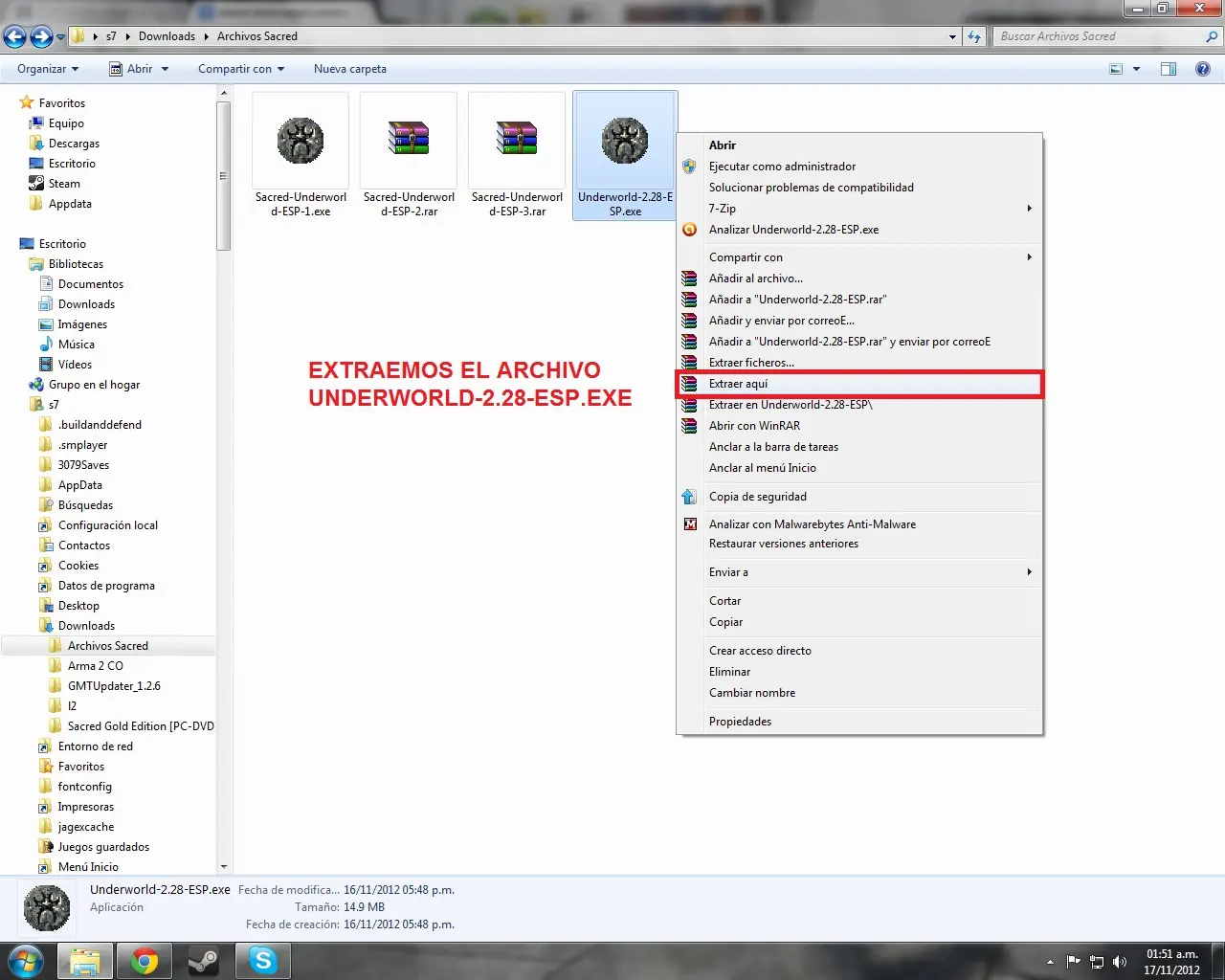 1) Descargar los 3 archivos, luego presiona click derecho en el archivo Sacred-Underworld-ESP-1.exe y extraigalo (por mas que sea un .exe)