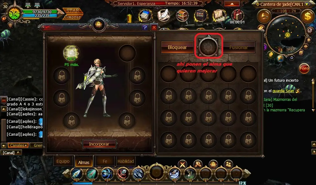 Lo primero que tenemos que hacer es poner el alma que queremos mejorar en el circulo vació que esta en el medio del botón bloquear y fusionar.