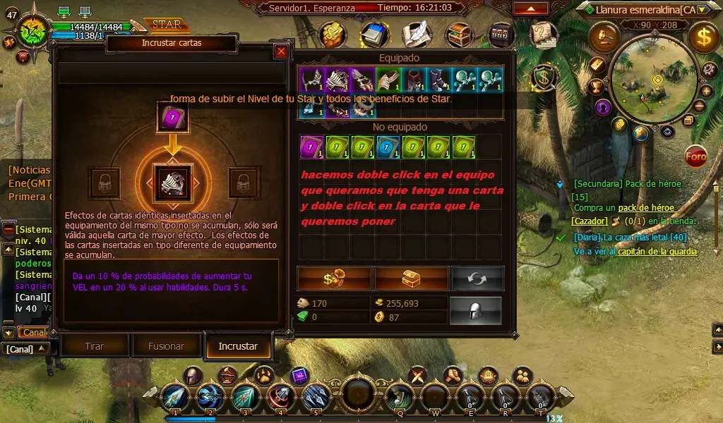 como podemos observar en esta imagen de mis cartas , tengo una carta por equipo (grebas,guantes,casco,anillos,collar,arma,arma de mano derecha , etc) esto puede marcar la diferencia en una batalla se equipan igual que una gema , así :