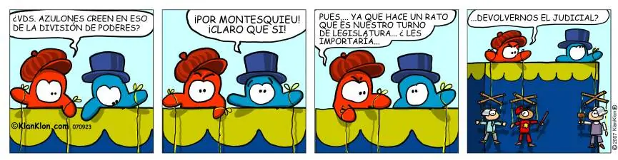 EL partido triunfa en las elecciones (ya que lo votan los ciudadanos para que el otro partido, que ha sido aún peor, no salga otra vez) y por tanto obtiene la mayoría parlamentaria consiguiendo así el poder legislativo,... de esa mayoría el partido decide montar un gobierno, el ejecutivo, luego la "Constitución" encarga al Parlamento la designación de los miembros del poder judicial,... así los tres poderes están en manos de los partidos políticos,.... marionetas de madera en manos de marionetas de trapo,... ¿de quién son en realidad las manos? ¿a qué estamos jugando?... guiñoles para niños, inocentes criaturas...