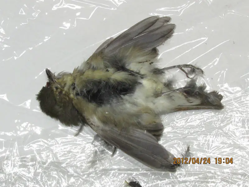 Esta imagen fue publicada en el blog de fotos de Takashi Morizumi . Al parecer, el Dr. Satoshi Mori fue el responsable de la opinión de los rayos X que muestra como puntos negros repartidos por todo el cuerpo de un pájaro pequeño de la aldea de Iitate. Los puntos se dice que son partículas radiactivas de Cs-137 internalizado por comer insectos contaminados.