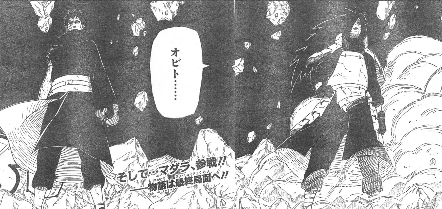Cuando el Ex Lider de los Uchiha llega un silencio toma lugar y Obito afirma que Madara desafio a la Resurección Impura y que no esperaba menos de él. Cuando Naruto lanza las Estacas Gigantes contra el duo, Obito le devuelve el Abanico de Guerra a Madara. quien los protegé con este infundido de chakra. Entonces Madara le increpa que comenzo el Proyecto por la mitad, y luego le preunta que sucedio con Nagato, y este le responde que los traiciono, Naruto ataca a Madara quien le devulve su ataque y le dice que el se encargara del Nueve y Ocho Colas y que Obito se encarggue de Kakashi y Gai. Entonces su anterior compañero le pregunto que paso con él y porque se alio a Madara y entonces Obito comeinza a recordar cuando Madara lo salvo del derrumbe, y llacia postrado en una cama con graves heridas.